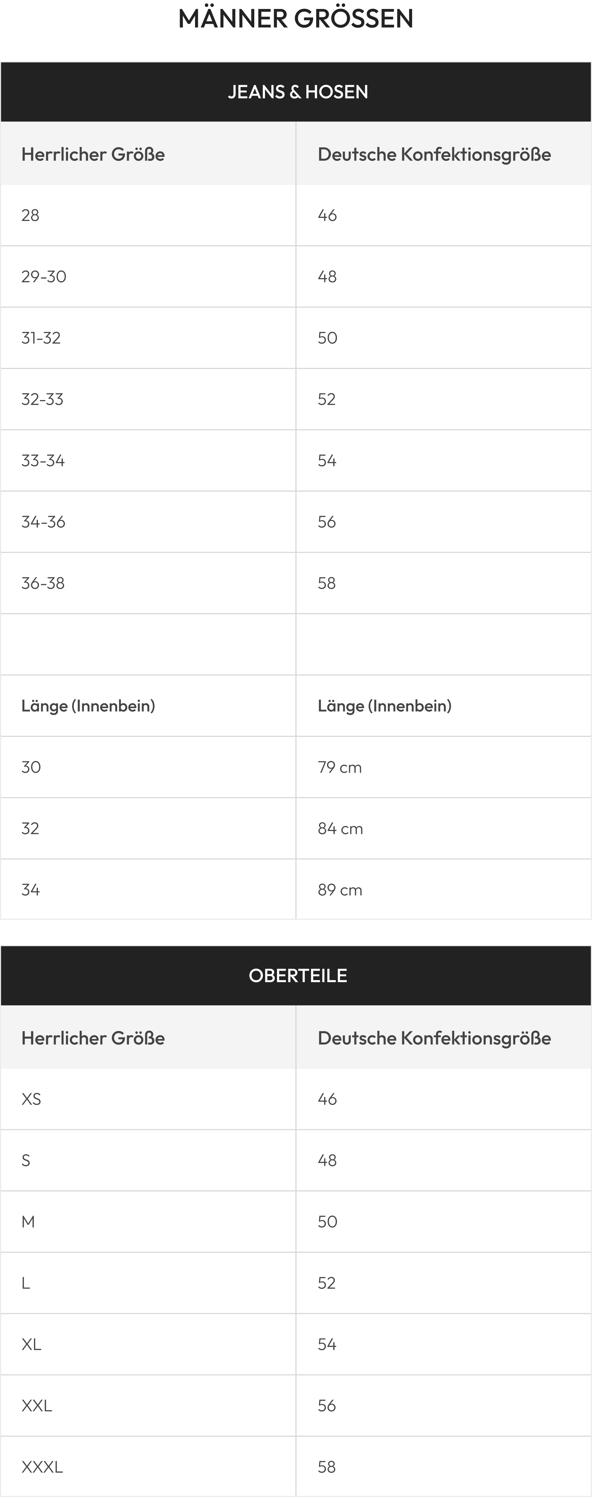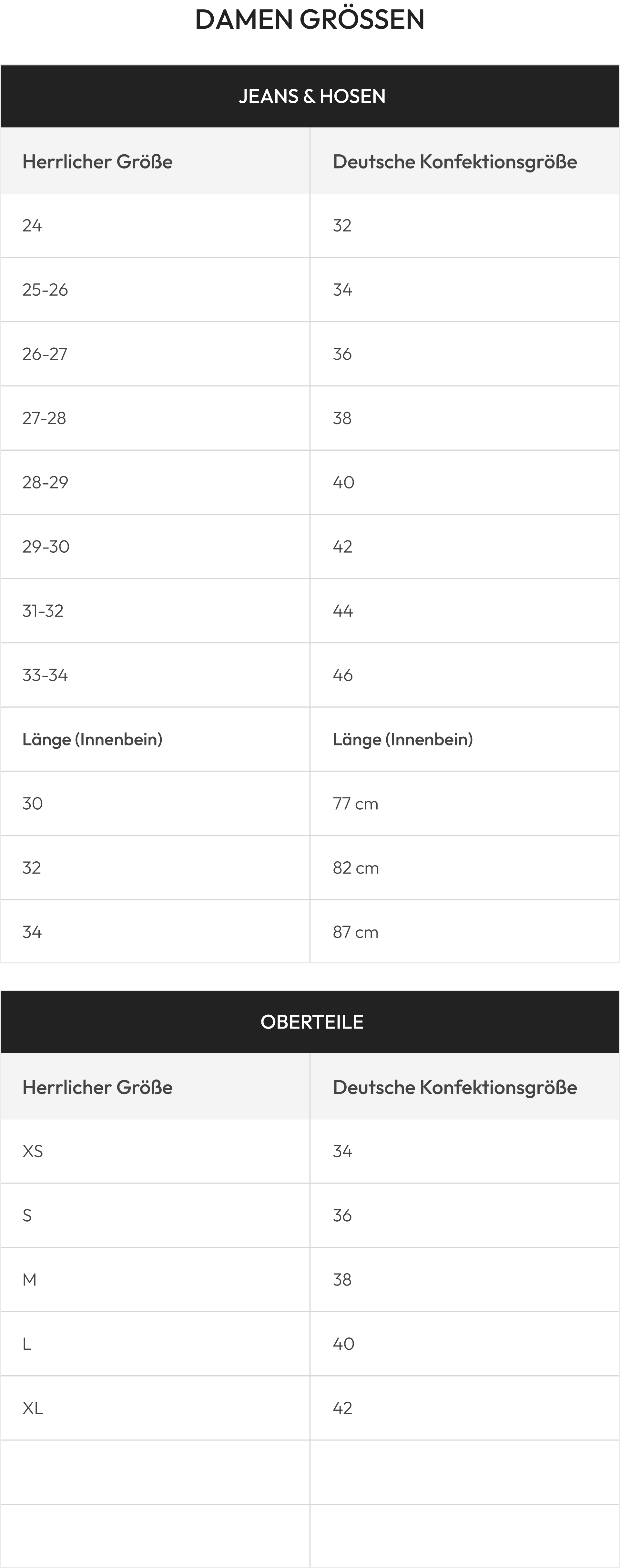Damen und Herren Jeansgrößen werden in der Regel in der amerikanischen Maßeinheit Inch angegeben, die Größenangaben für Jeans unterscheiden sich deshalb von den Größen für Stoffhosen. Die Herrlicher Größentabelle für Damen und Männer soll Ihnen dabei helfen, die passende Herrlicher Größe zu finden. In der linken Spalte ist jeweils die amerikanische Jeansgröße in Inch angegeben, in der Spalte daneben finden Sie die in Deutschland übliche Konfektionsgröße. Um die Herrlicher Jeansgröße zu bestimmen, können Sie sich also einfach nach der Kleidergröße richten, die Sie normalerweise tragen. Ein genaueres Ergebnis bekommen Sie allerdings, wenn Sie die Jeansgröße ausmessen. Für die Jeans sind zwei Werte wichtig: die Weite und die Länge. Um Ihre richtige Inch-Größe zu bestimmen, messen Sie einfach Ihren Bundumfang und die Schrittlänge innen am Bein. Danach teilen Sie den Bundumfang und die Schrittlänge durch 2,54 (1 Inch entspricht ca. 2,54 cm). Das Ergebnis ist Ihre passende Jeansgröße.