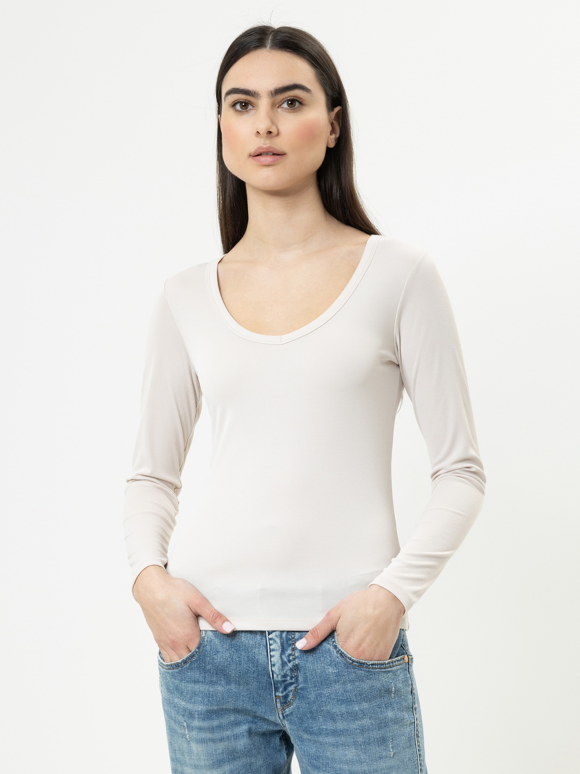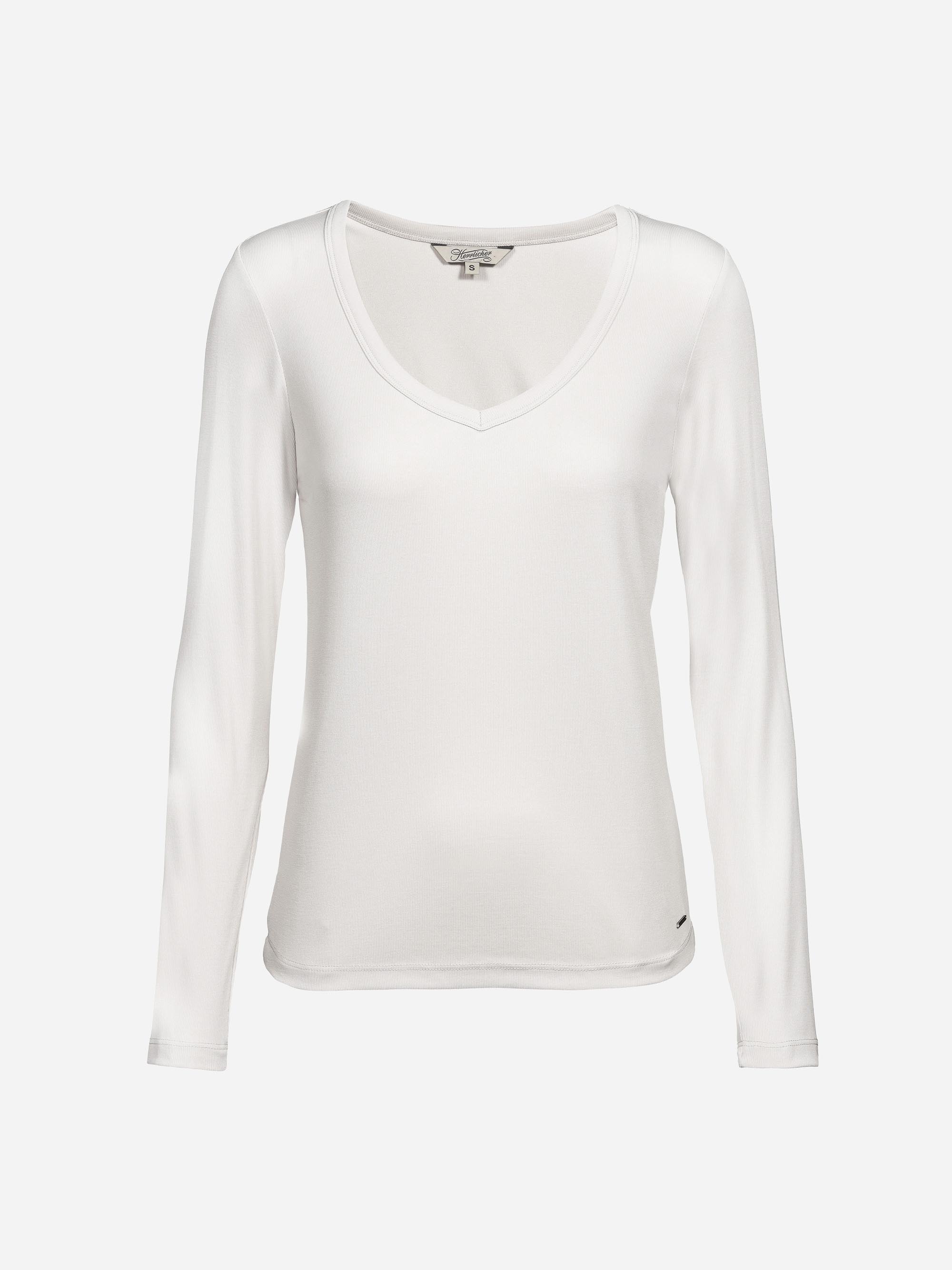 Das Aveline Langarmshirt aus angenehmer Modal Qualität liegt soft auf der Haut mit feiner Rippenstruktur. Dabei ist das Shirt firgurnah geschnitten, hat schmale Ärmel und einen tiefen V-Ausschnitt. Die dezente Metallplakette am Saum bezeugt beste Qualität aus der Manufaktur feinsten Textils.