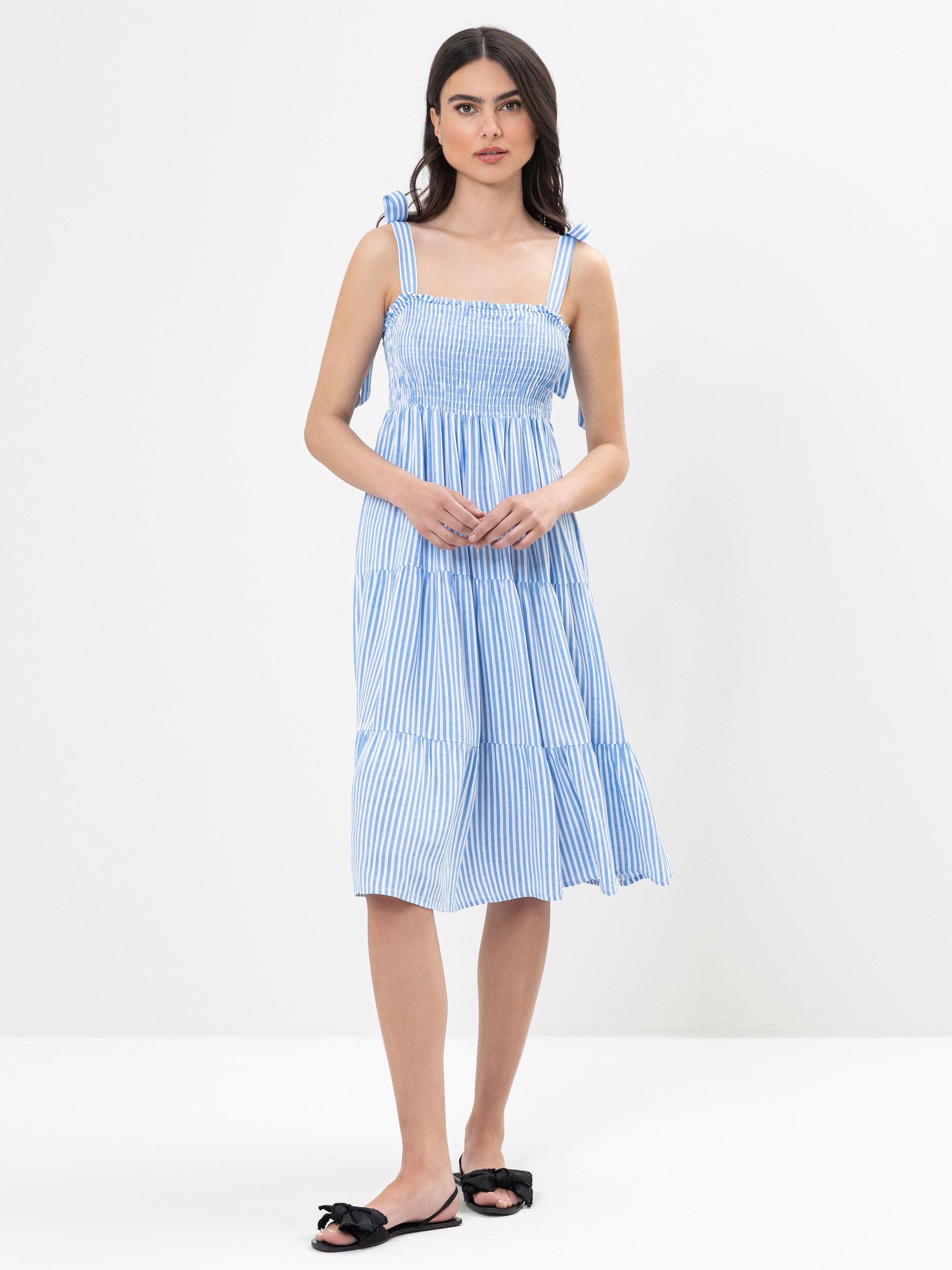Mit verspielten Details punktet unser Trägerkleid Buena im Streifenlook. Träger zum Binden, ein gesmoktes Oberteil und viel Weite dank Stufen, machen das Sommerkleid so bezaubernd.