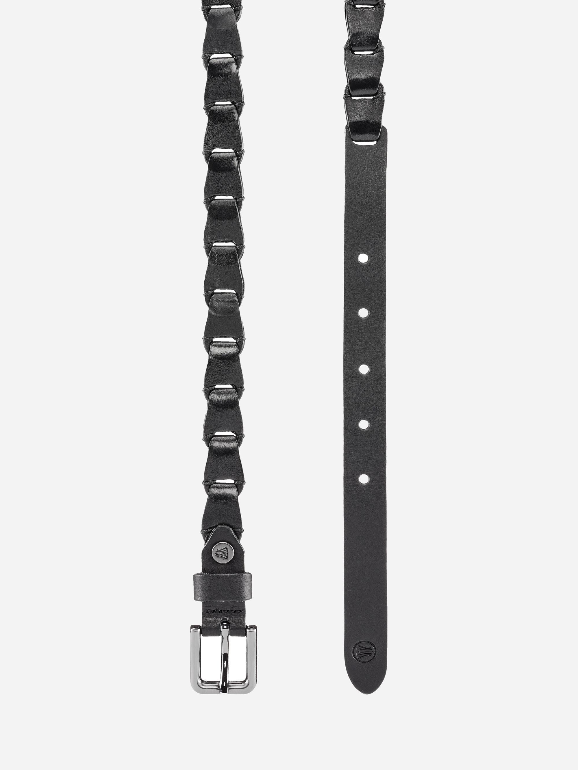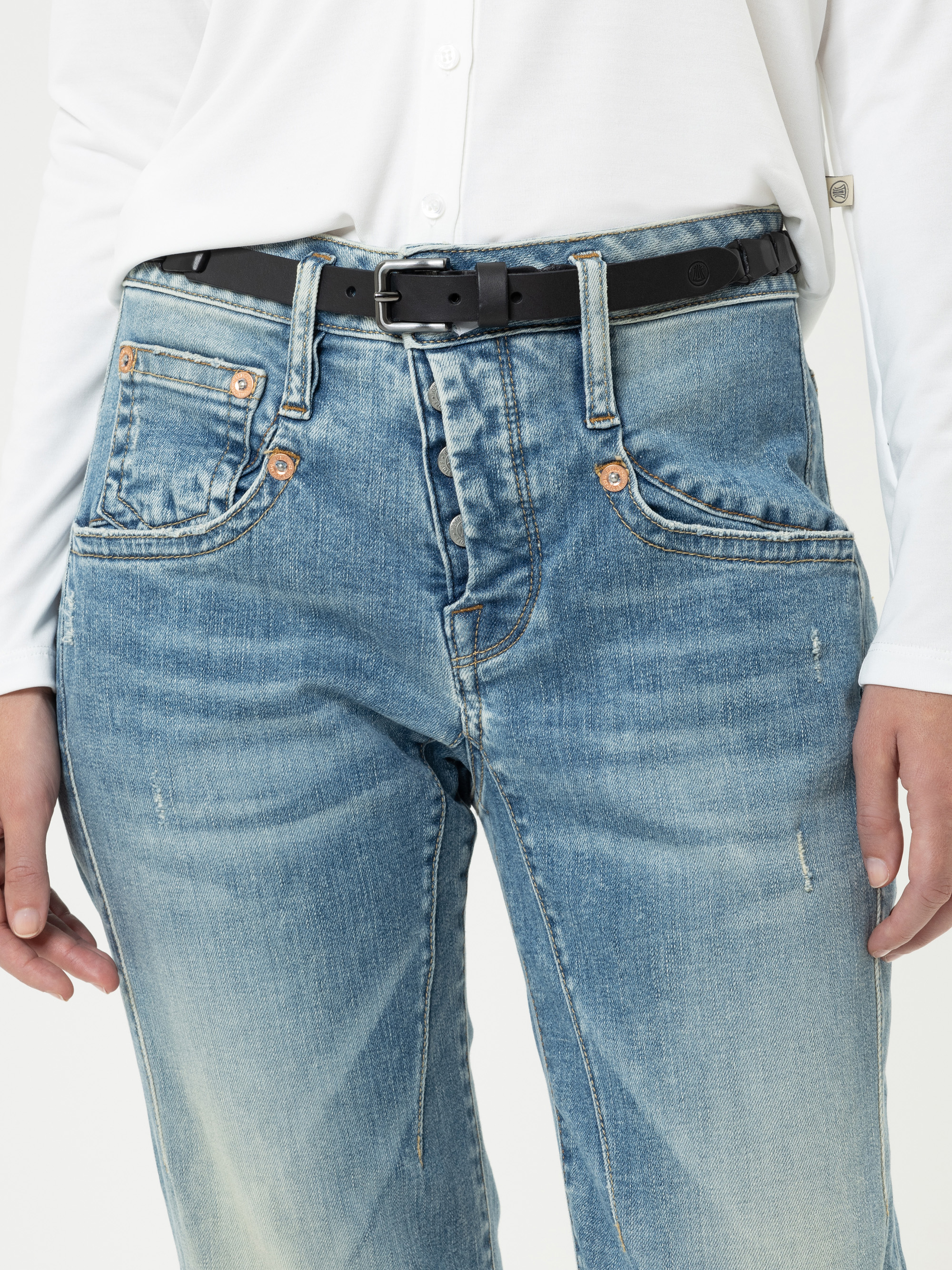 Unser Gürtel Mireille, der aus beweglichen Gliedern aus Echtleder zusammengesetzt ist, hat eine feine Metallschließe mit Dorn. Das Herrlicher Weberkamm-Emblem steht für unsere Manufaktur feinsten Textils.
